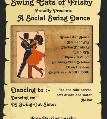 Swing Cats of Frisby social swing dance. Dancing to Swing DJ - Swing out Sister. Complimentary tea, coffee and cake to be served around 9.30, water and squash will be available all evening. Hope to see you there.