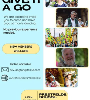 Come along and find out more about the Shrewsbury Morris Dancers and have a go. Its great fun, good exercise and you will be welcomed by a really friendly group of people.