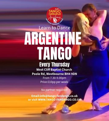 Join Leo and Tracey from Tango Fandango to learn Argentine Tango every Thursday at the West Cliff Baptist Church Hall from 7.30-9.00pm.